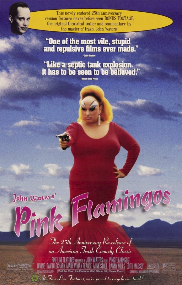 John Waters was the guest of honor at this year’s /slash filmfestival. One evening, they showed four of his most famous movies back to back, and I watched two of them. Beforehand, I expected to struggle through “Pink Flamingos” and was sure that “Female Trouble” would be more to my liking. Ultimately, though, it turned out to be the other way around. Despite the fact that “Pink Flamingos” relies heavily on shock value and tries to rattle the “establishment”, it did so with such an amount of charm that despite a couple of unnecessary icky scenes (Divine eating dog poo, the sex scene with the chickens – yes, I know, they ate them afterwards, but still the way they died didn’t really look very pleasant, and constitutes animal abuse) I found it hard to fault it for that. It offers plenty of weird, memorable characters and a couple of gloriously silly scenes and funny quotes (“What a day for an execution.”, “The couch rejected me!”, and, my favorite, “There are two kinds of people: My kind of people, and assholes.”) I also enjoyed the little commentary by Waters himself at the end of the film (shot and added in the 90s), where he presented a couple of deleted scenes. Granted, apart from Divine (who’s really good and has tremendous screen presence) the acting mostly isn’t anything to write home about, despite its short runtime it could have been even a little shorter, some (running) gags wear off rather quickly, and it’s obvious that this was shot for an amount of money that on other productions probably wouldn’t be enough to afford just one trailer. But it’s laudably anarchistic filmmaking that offers an experience that you couldn’t have had anyway (or -where) else. Overall, I was pleasantly surprised by how entertained I was, especially considering the fact that movies that rely mostly on shock value usually aren’t my cup of tea. This, however, to my own surprise, largely was.